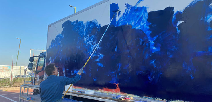In his work on the truck, Gold opted for images that continue his series of paintings depicting women and men engaged in planning and painting spaces. The most prominent characteristic of these paintings is the element of movement and the background of intense blue pigment that brilliantly illuminates their labor as a unique moment. Gold also incorporated colored chalks in his work.